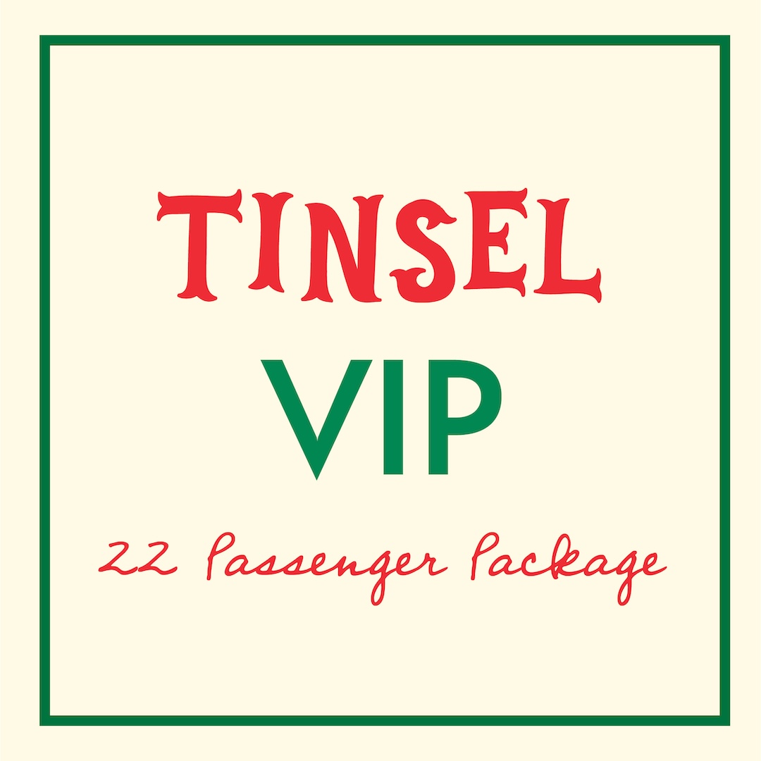 Turn your Tinsel experience into a rolling holiday celebration! This spacious party bus seats up to 22 passengers and includes 5 hours of private chauffeuring along the route.